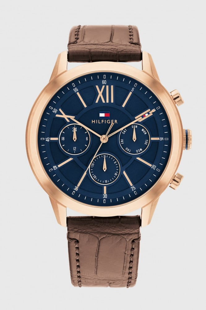 ساعة تومي هيلفيغر الرجالية. الوقت في صالحك عندما ترتدي هذه الساعة الأنيقة التي تتميز بوجه مفصل متعدد الطبقات ، وأقراص فرعية ، وحزام جلدي بني منقوش بنقشة جلد التمساح.