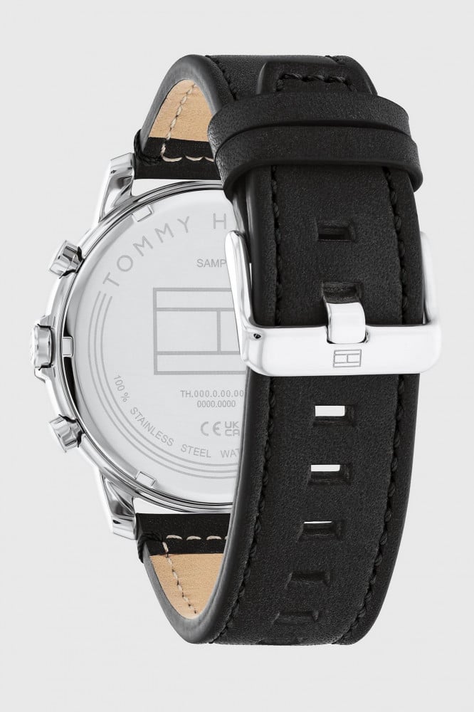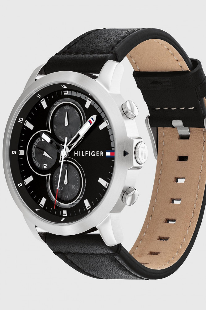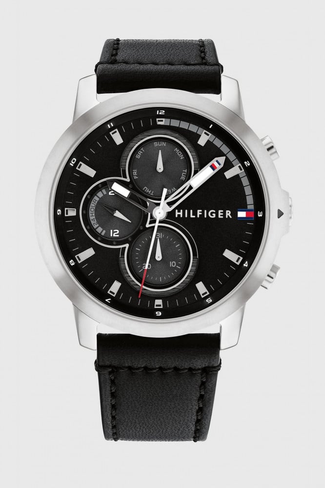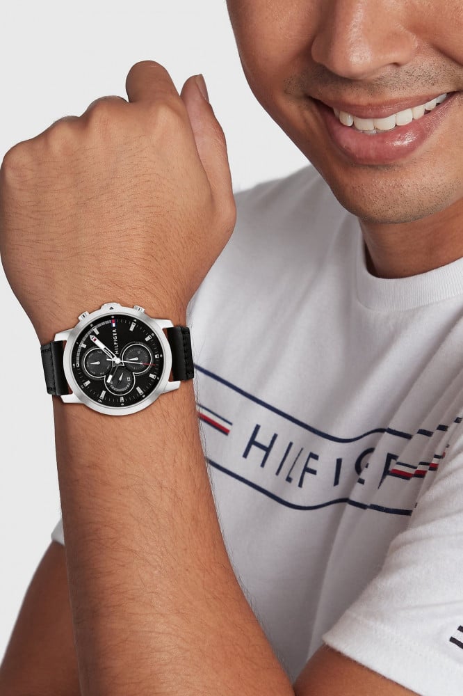 ساعة تومي هيلفيغر الرجالية. الوقت في صالحك مع تصميمنا العصري على الساعة غير الرسمية. تتميز بإطار جريء ، وأقراص فرعية متعددة الطبقات ، وعقارب هيكلية مع حزام من الجلد الأسود وحركة متعددة الوظائف.